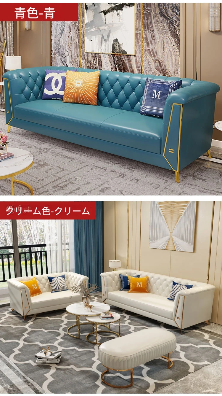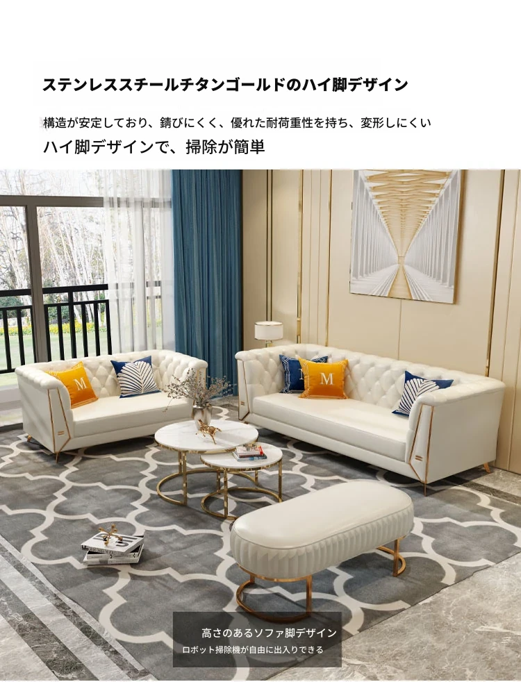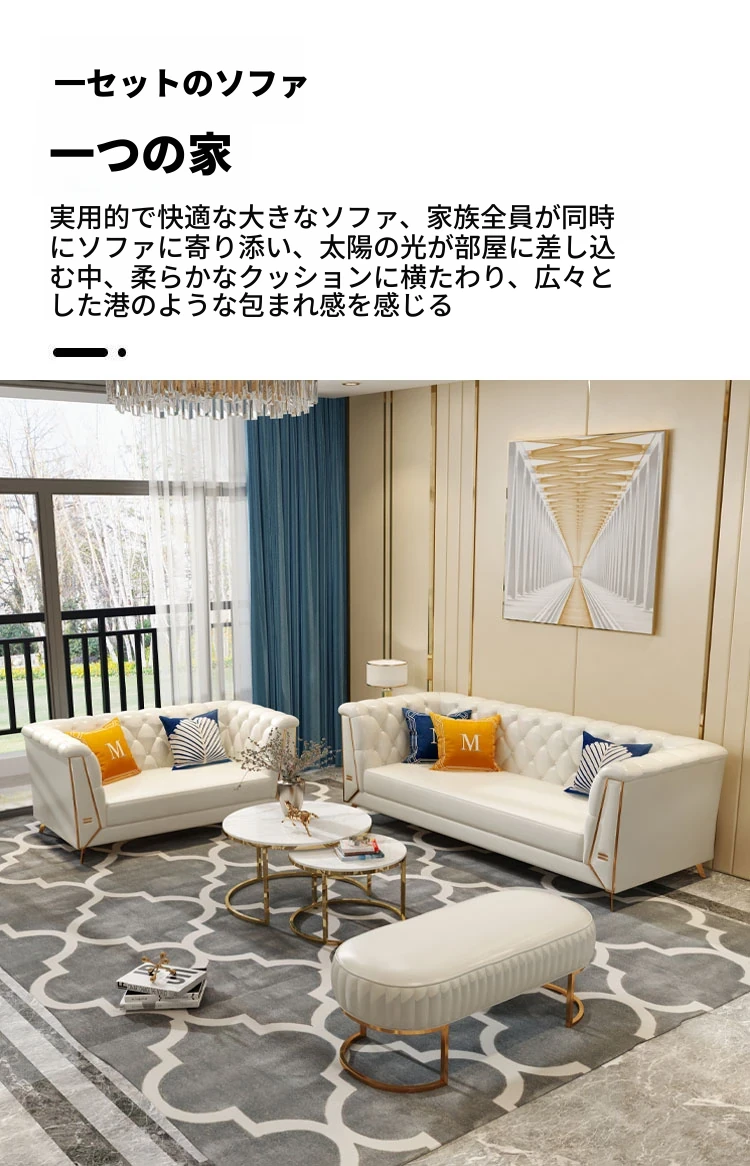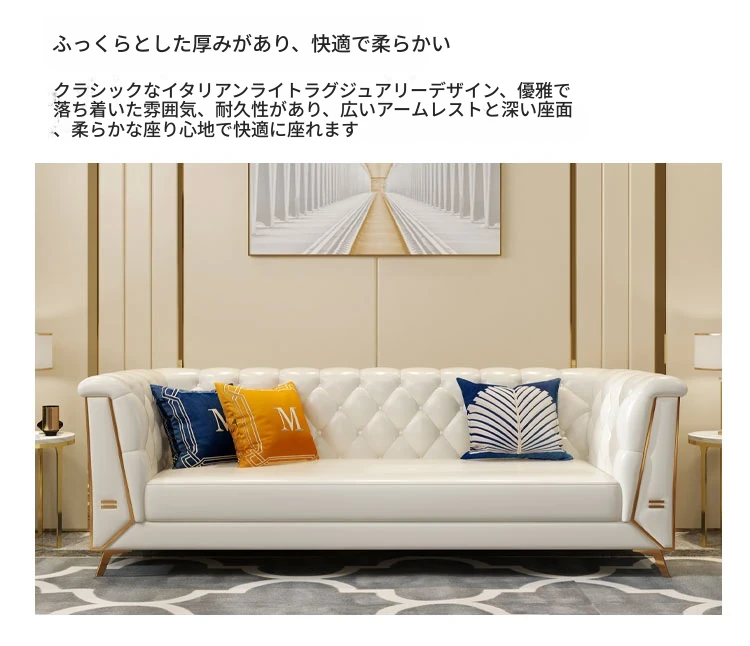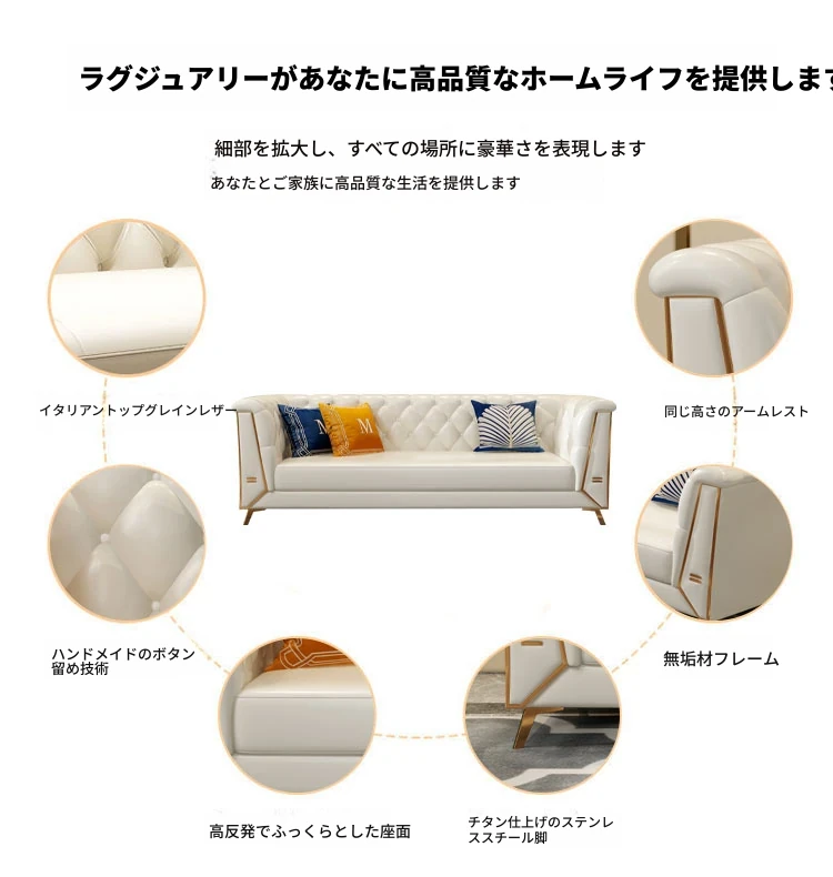 ラグジュアリーなクリーム色の高級リビングソファ!本革製の小型3人掛け&4人掛けコンビネーションソファで、白を基調とした洗練されたデザイン。おしゃれな空間を演出し、快適なひとときを提供します。