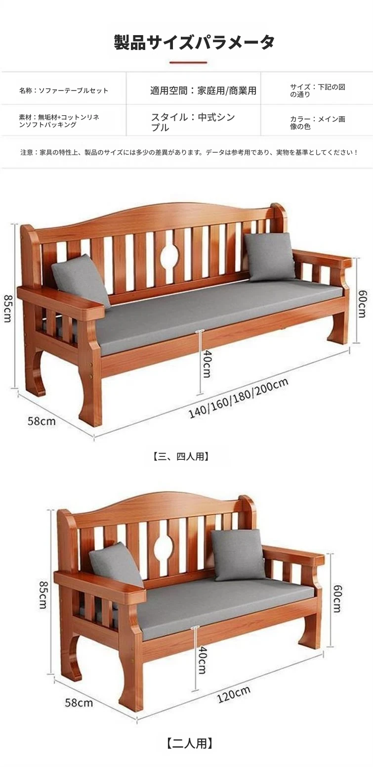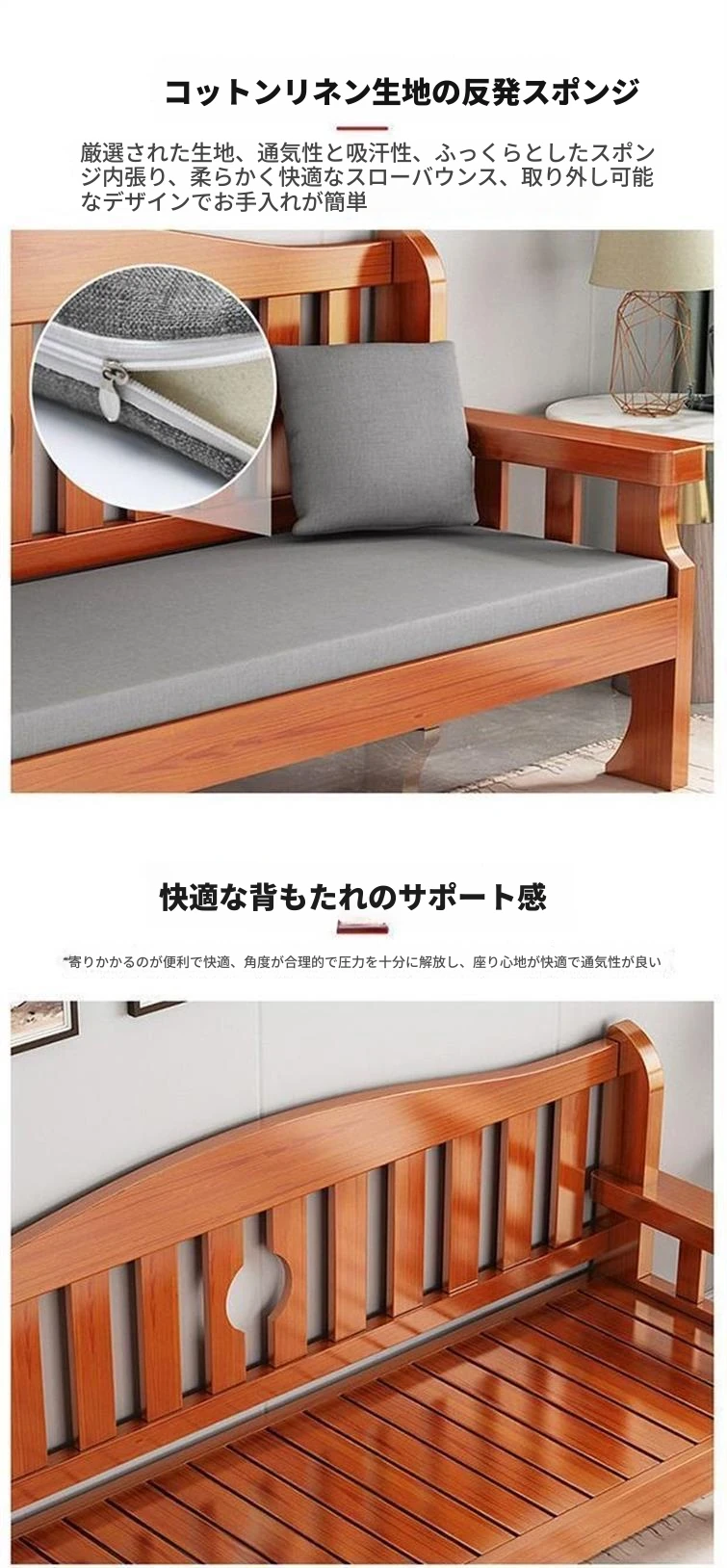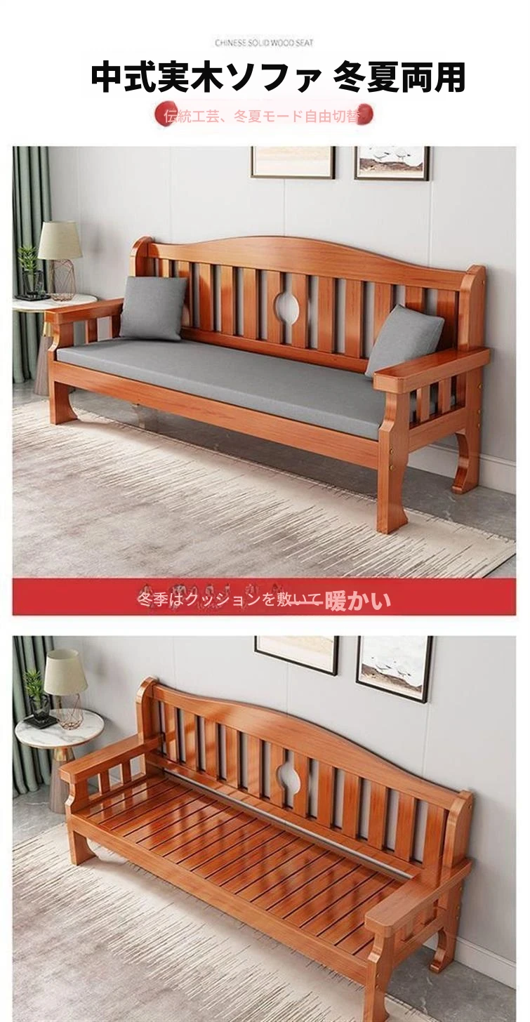 シンプルな中華スタイルの3人掛けソファセット - 小さなリビングに最適な実木製のモダンな背もたれ付きベンチ。心地よい空間を演出し、温もり溢れるおしゃれなインテリアを実現します!