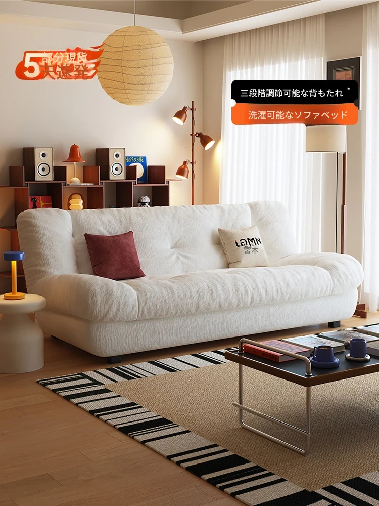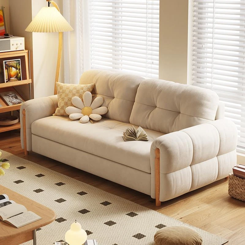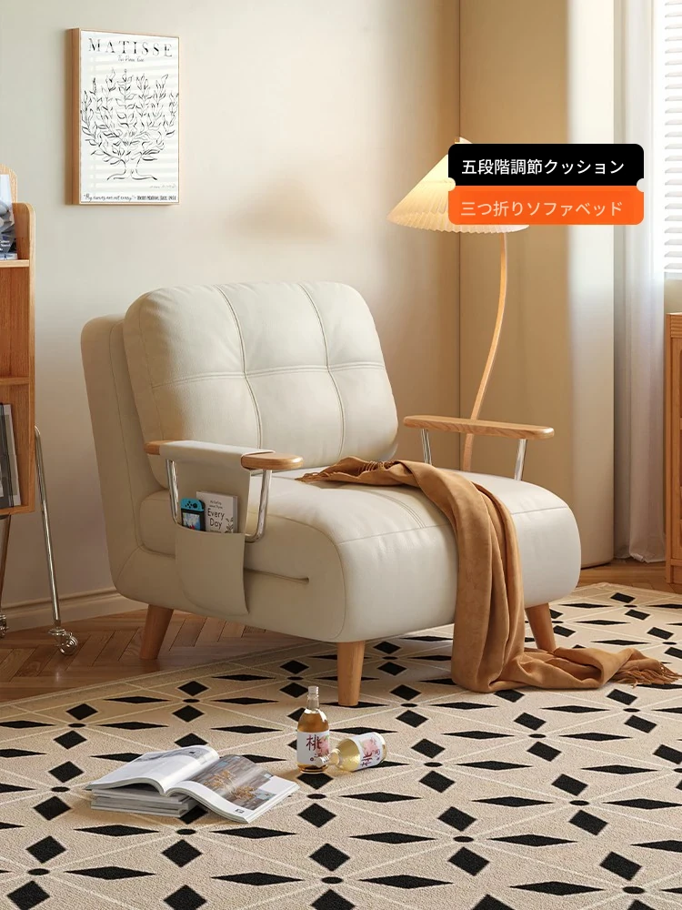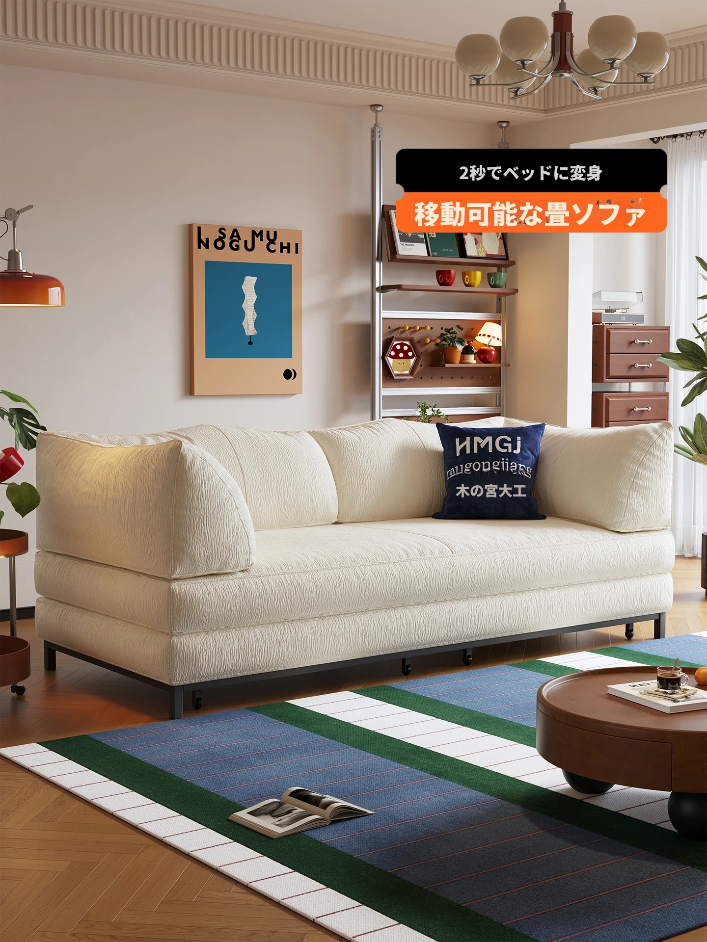 木宮巧匠と葉のクリーム風デザイン、コンパクトなリビングに最適な多機能折りたたみソファベッド。快適さとスタイルを両立した、あなたの空間を彩る一品!