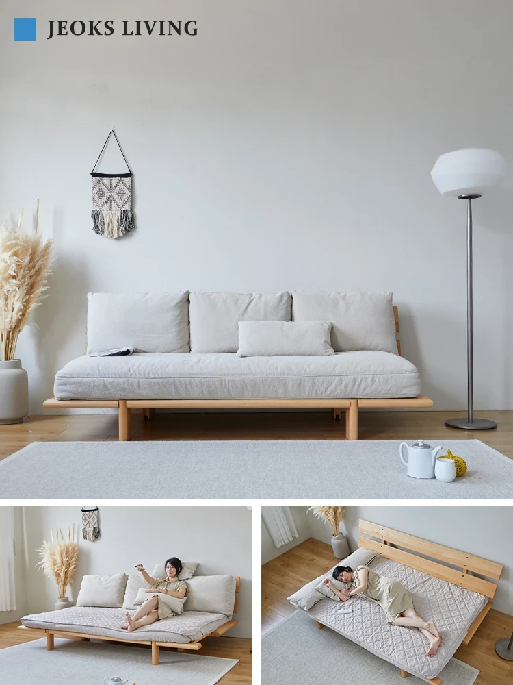 Minimalist Japanese-style Solid Wood Sofa Bed - Space-Saving, Foldable, and Washable Design for Small Living Rooms, Perfect for Versatile Use